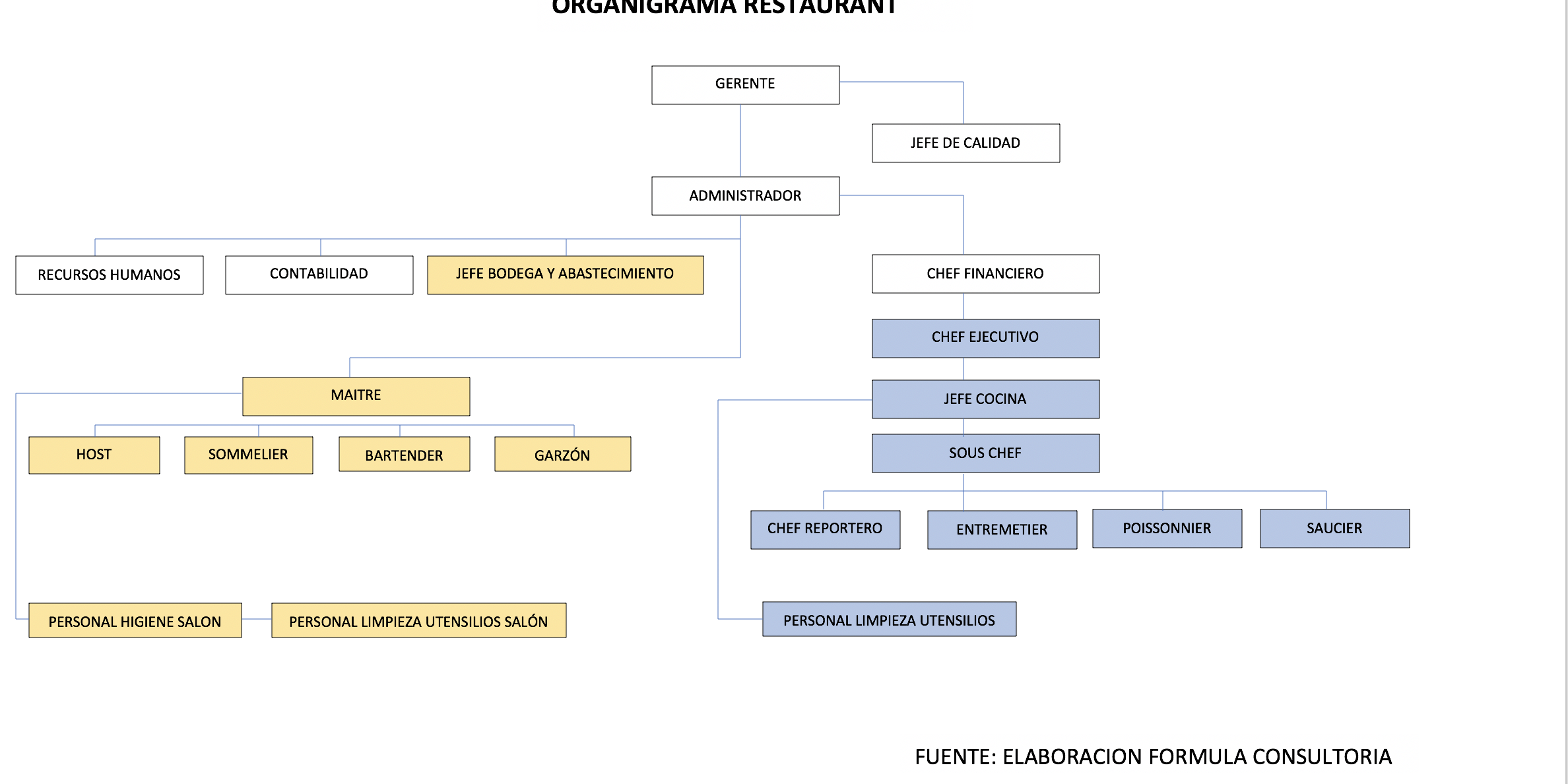 Como en todas las industrias, en los restaurant se requiere determinar una línea de mando que permita realizar las operaciones de manera eficiente y sin conflictos entre todo el personal. Para ello, es necesario elaborar un organigrama que permita establecer jefaturas, liderazgos y dependencias.